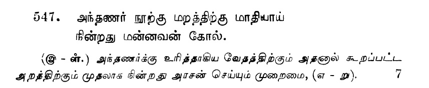 நல்ல அரசன் அந்தணர்களின் வேத அற நூல்களை உறுதுணையாய் ஆட்சி செய்ய வேண்டும், அரசன் மோசமான ஆட்சி செய்தால் அந்தணர் வேதம் மறப்பர் என வள்ளுவர் அந்தணர்களையும் வேதங்களையும் போற்றி கூறுகிறார்.