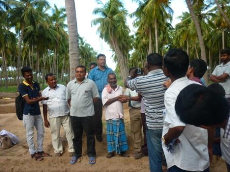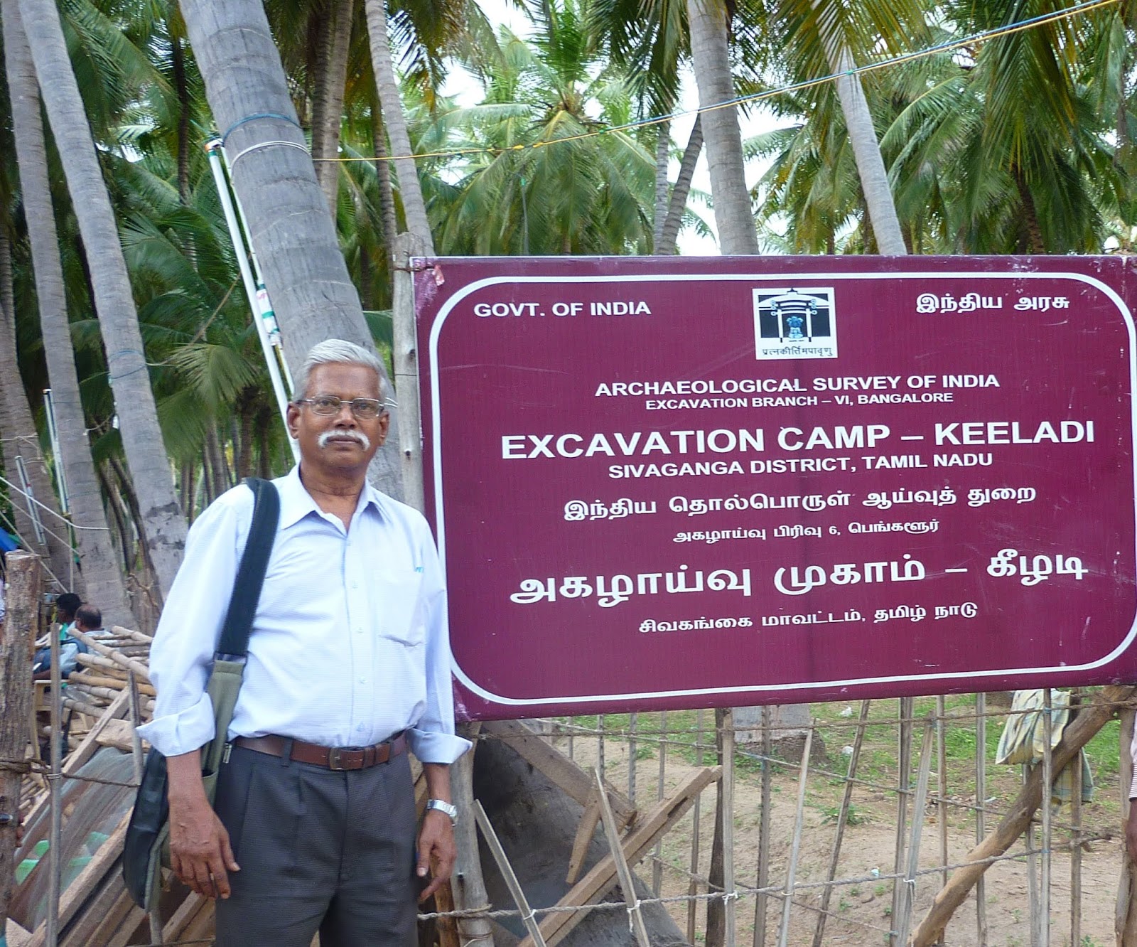 நாங்கள் சென்றது ஞாயிற்றுக் கிழமையாதலால் அகழாய்வுக் களத்தில் பணியேதும் நடைபெறவில்லை. ஓரிரு பெண் பணியாளர்கள் இருந்தனர். எங்கள் பயண மேலாளர் திரு. ஜெகதீசன் (கல்வெட்டு ஆய்வாளர்), தொல்லியல் துறை அலுவலரைத் தொடர்புகொண்டு பேசியிருந்ததால், ஆய்வுப்பணியில் உள்ள இளநிலை அலுவலர் ஒருவர் அங்கு வந்தார். நாங்கள் சென்ற நேரத்தில் மழை இல்லாவிடினும், அண்மையில் இப்பகுதியில் பெய்த மழை காரணமாகக் குழிகள் அனைத்தும் “தார்ப்பாலின்” போன்ற துணிகளால் மூடி வைக்கப்பட்டிருந்தன. இளநிலை அலுவலர் ஓரிரு குழிகளைத் திறந்து காட்டினார். ஒரு பகுதியில், பாத்தி பாத்தியாகப் பிரித்து ஆய்வுக்குழிகளில் எடுத்த பானைச் சில்லுகளைக் குவித்து வைத்திருந்தனர். ஒளிப்படம் எடுக்கத் தடை இருந்ததால் யாரும் ஒளிப்படம் எடுக்கவில்லை. காட்சிகளை மனத்தில் பதித்துக் கொள்ள வேண்டியதாயிற்று. இளநிலை அலுவலர் கூறிய சில செய்திகள் வருமாறு: